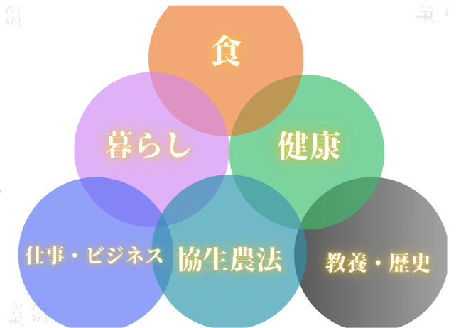 6つのエレメント(住宅医学、食、心と身体、仕事・ビジネス、教養・歴史、協生農法)